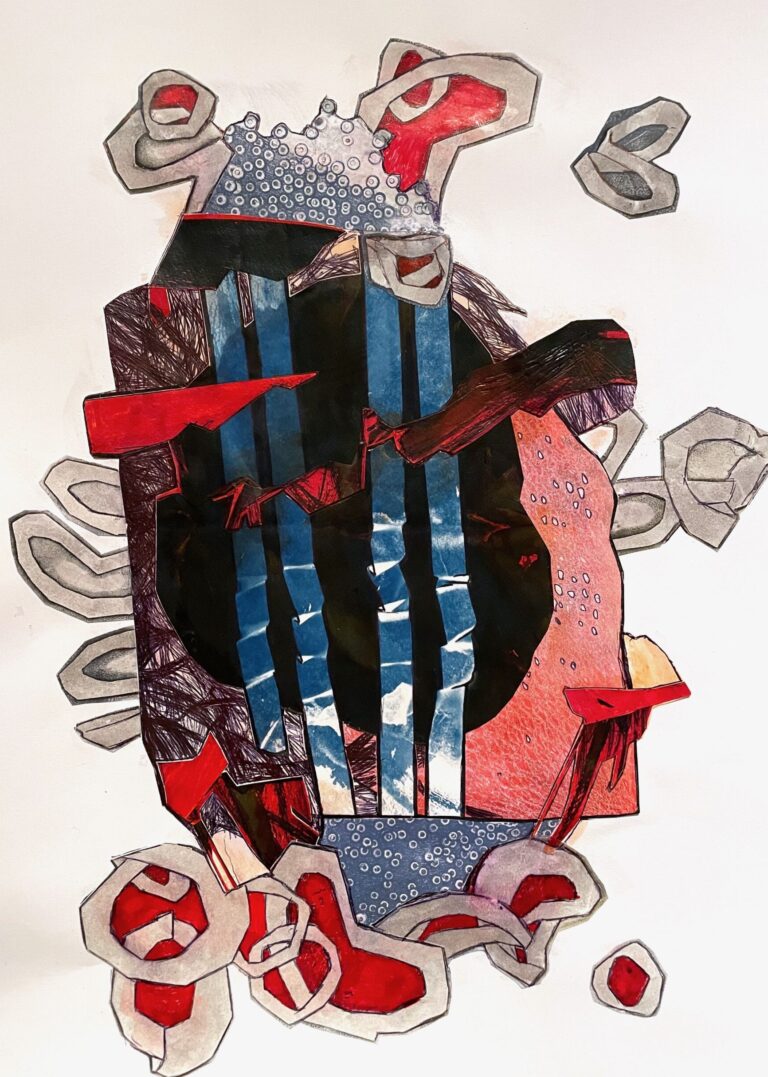 Radierung überzeichnet + collagiert, Mischtechnik 40×30 cm, 2023