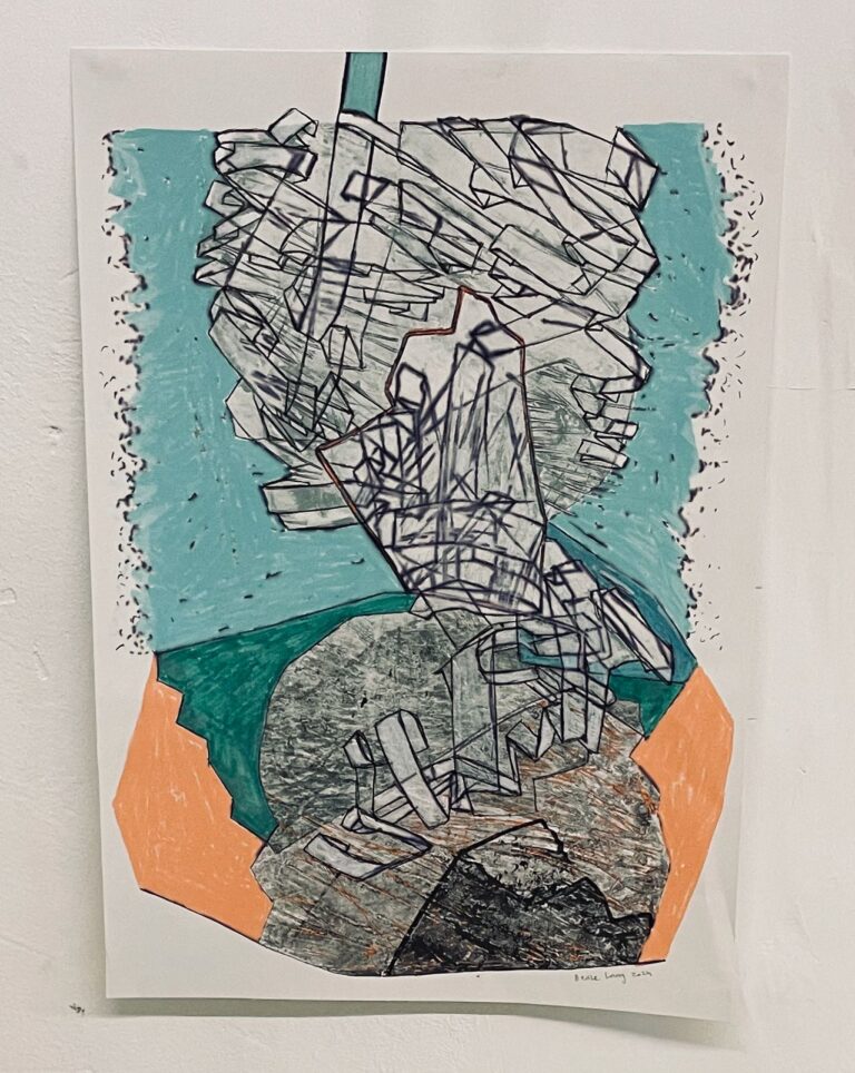 Collage aus Druckgrafiken + Zeichnung, 60×50 cm, 2024