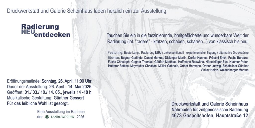 - „Radierung NEU entdecken“, Galerie Scheinhaus Gaspoltshofen, 26.04.–14.05.2026